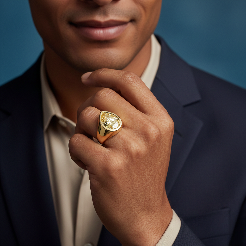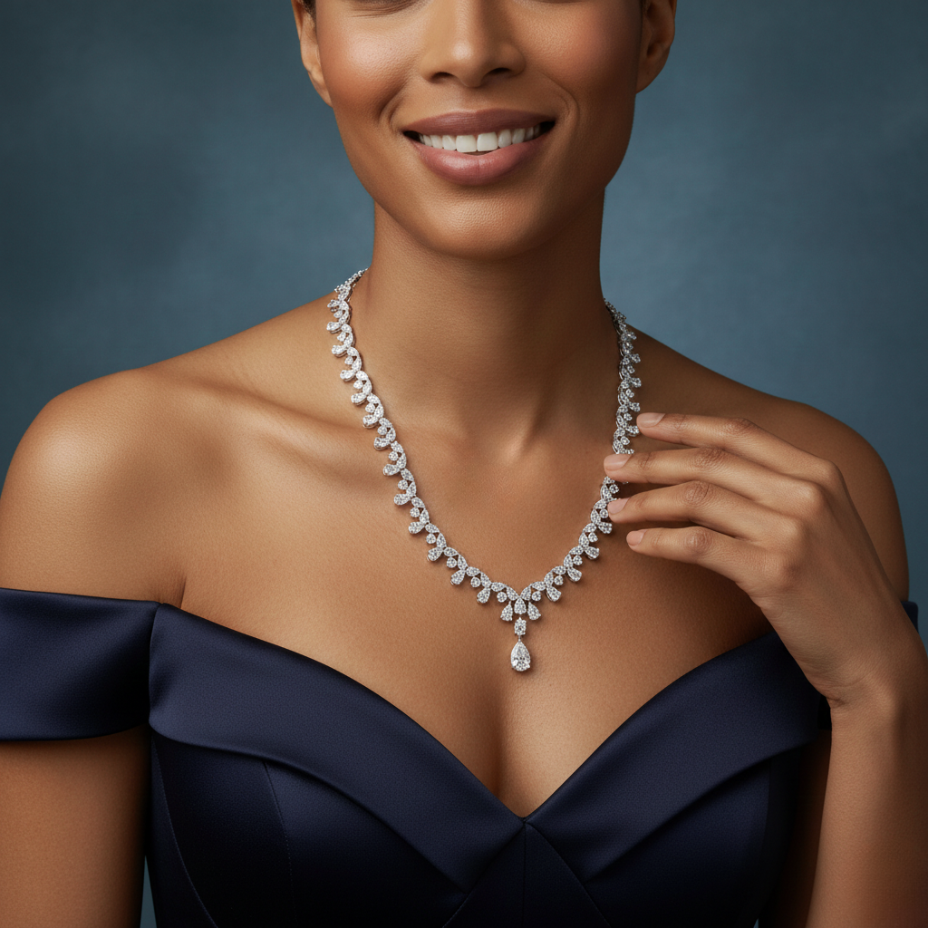 A thoughtfully curated ensemble of pear cut diamonds. Cascading across the necklace and earrings, mirrored through the bracelet, and crowned with a pear at the center of the ring.