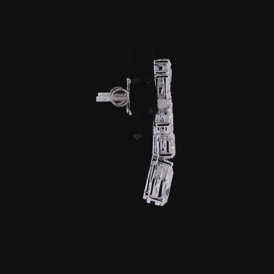 Each earring is thoughtfully arranged to create fluid movement and balanced symmetry. Graduated pear diamonds form an elegant silhouette, complemented by an oval accent and a single round diamond for contrast and light performance. The proportions are deliberate, allowing every stone to breathe while maintaining architectural harmony.
