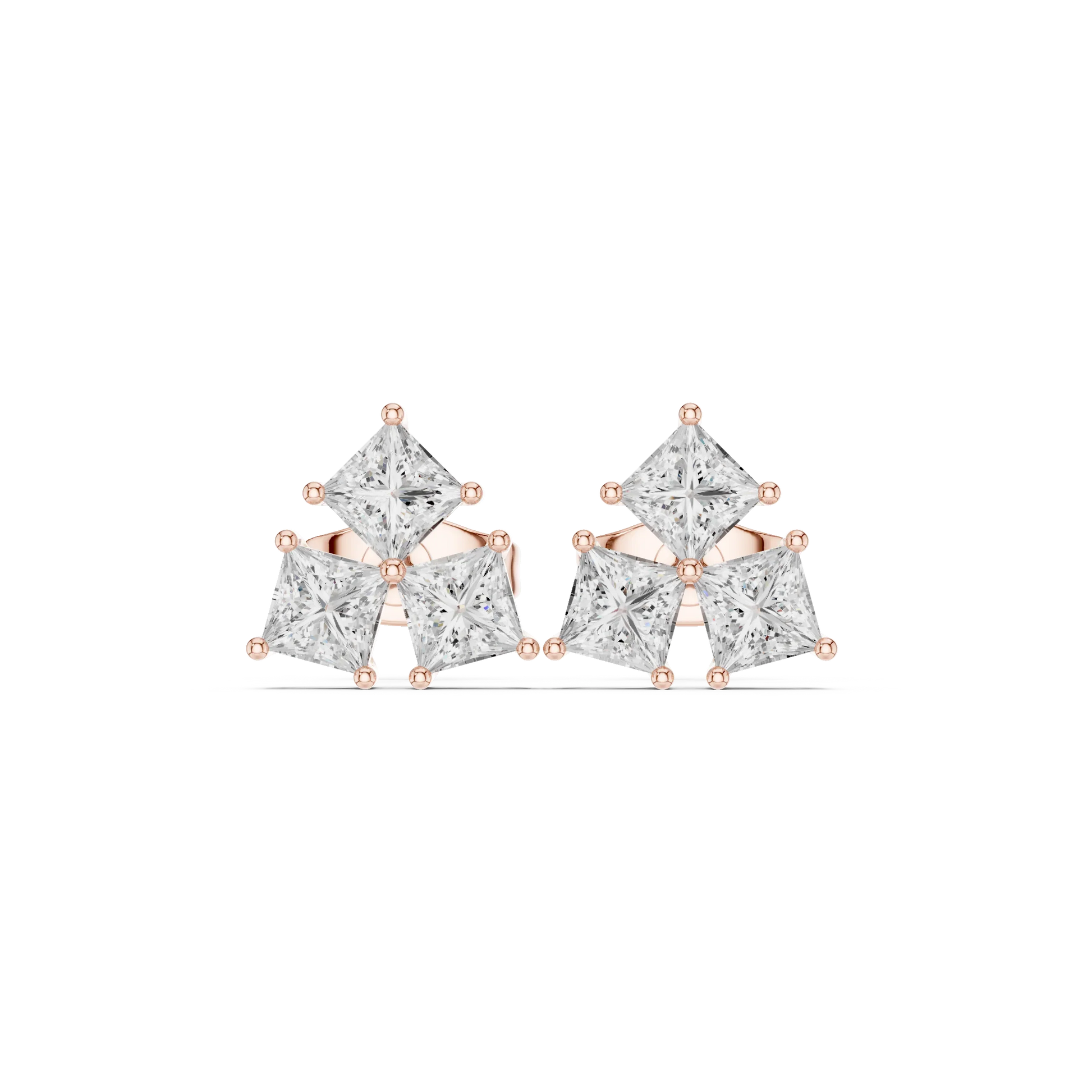Three Stone Princess Cut Diamond Stud Earrings